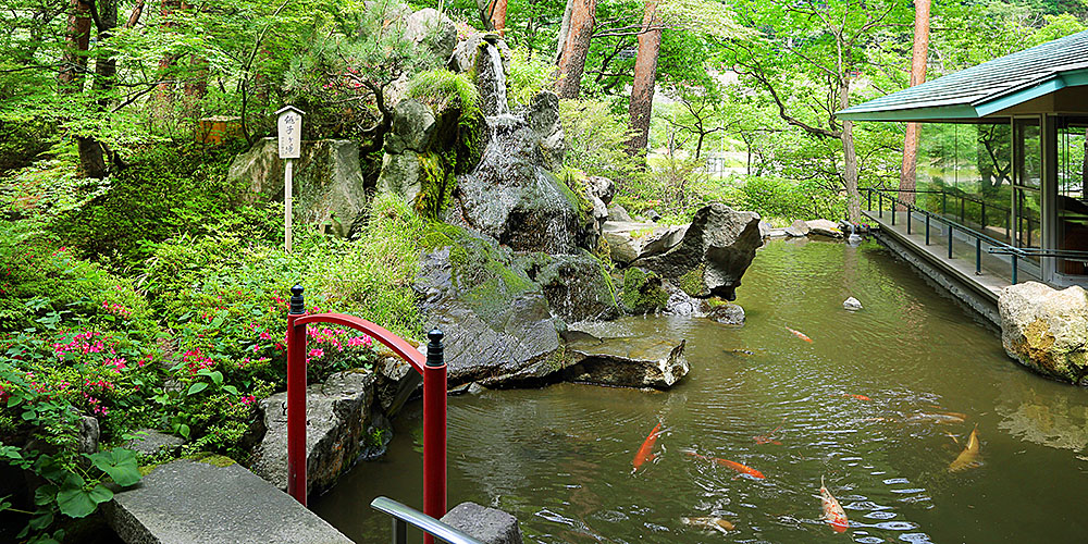 池の鯉にエサやり体験も人気です。