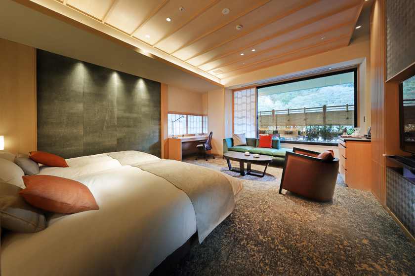 | 設備 | 源泉放流私人露天風呂、雨淋式花灑、餐桌空間、Simmons雙人床×2、 60吋智慧型電視、步入式衣櫥、Hollywood化妝鏡、空氣清淨機、獨立空調、書桌(W1200×H600)、Herman Miller人體工學椅、工作燈、高速Wi-Fi |