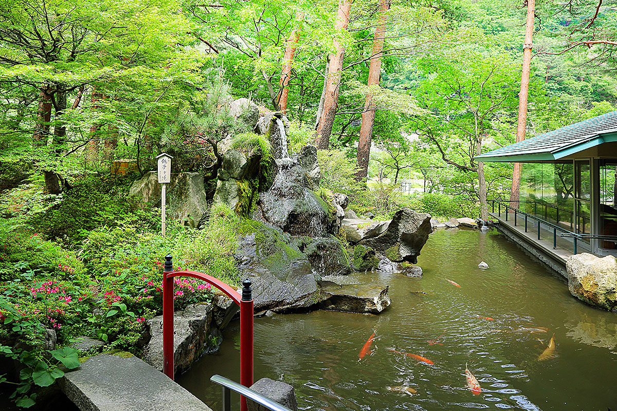 庭園池塘中的鯉魚餵食體驗也深受旅客喜愛。