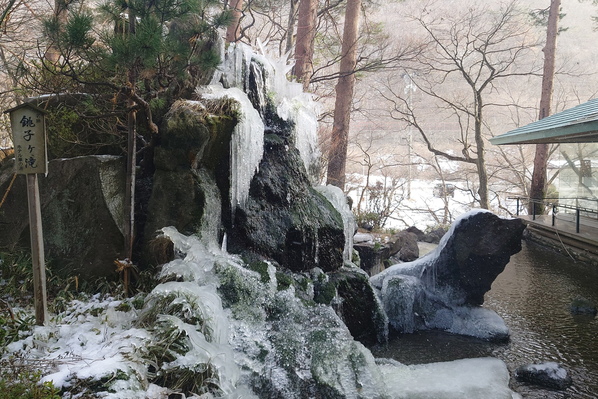 附近的名勝「銚子瀑布」,因外形如同酒壺而得名。